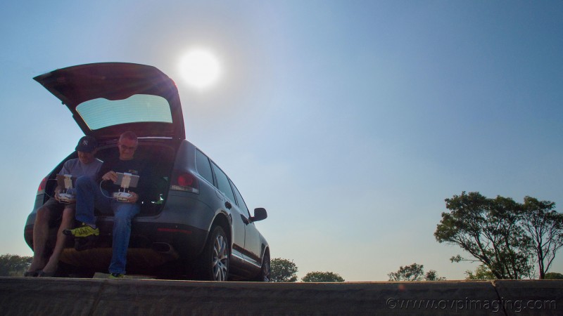 The drone is operated via a master remote control device, with a second remote control available if someone other than the pilot is operating the camera, as Chris was doing on this shoot while Dave was flying the drone. So they rocked their selfie by setting up their shot and then holding the remote controls behind their backs as they took the picture. This gives you an idea of the versatility that’s possible in terms of selfies.
